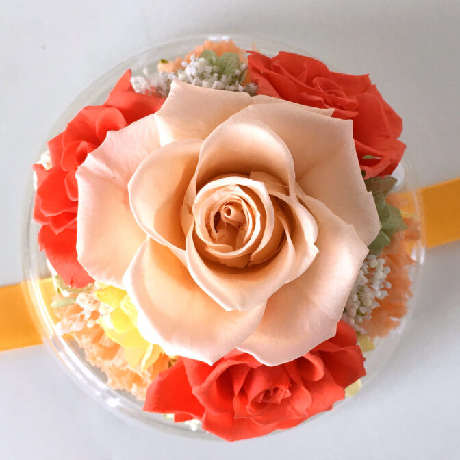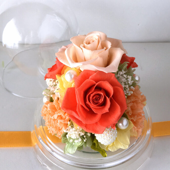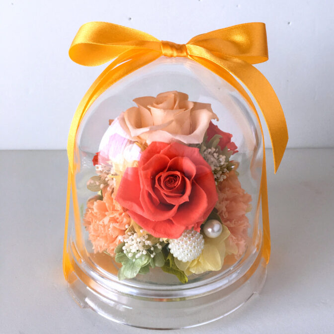 お見舞いや誕生日祝いに人気のドーム型プリザーブドフラワー|チャーム(オレンジ)
