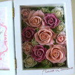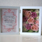 上品なラベンダーピンクのローズをあしらった、フォトフレームタイプのアレンジメントです。見開きタイプのフレーム(額)の右側に12輪のローズ、左側に